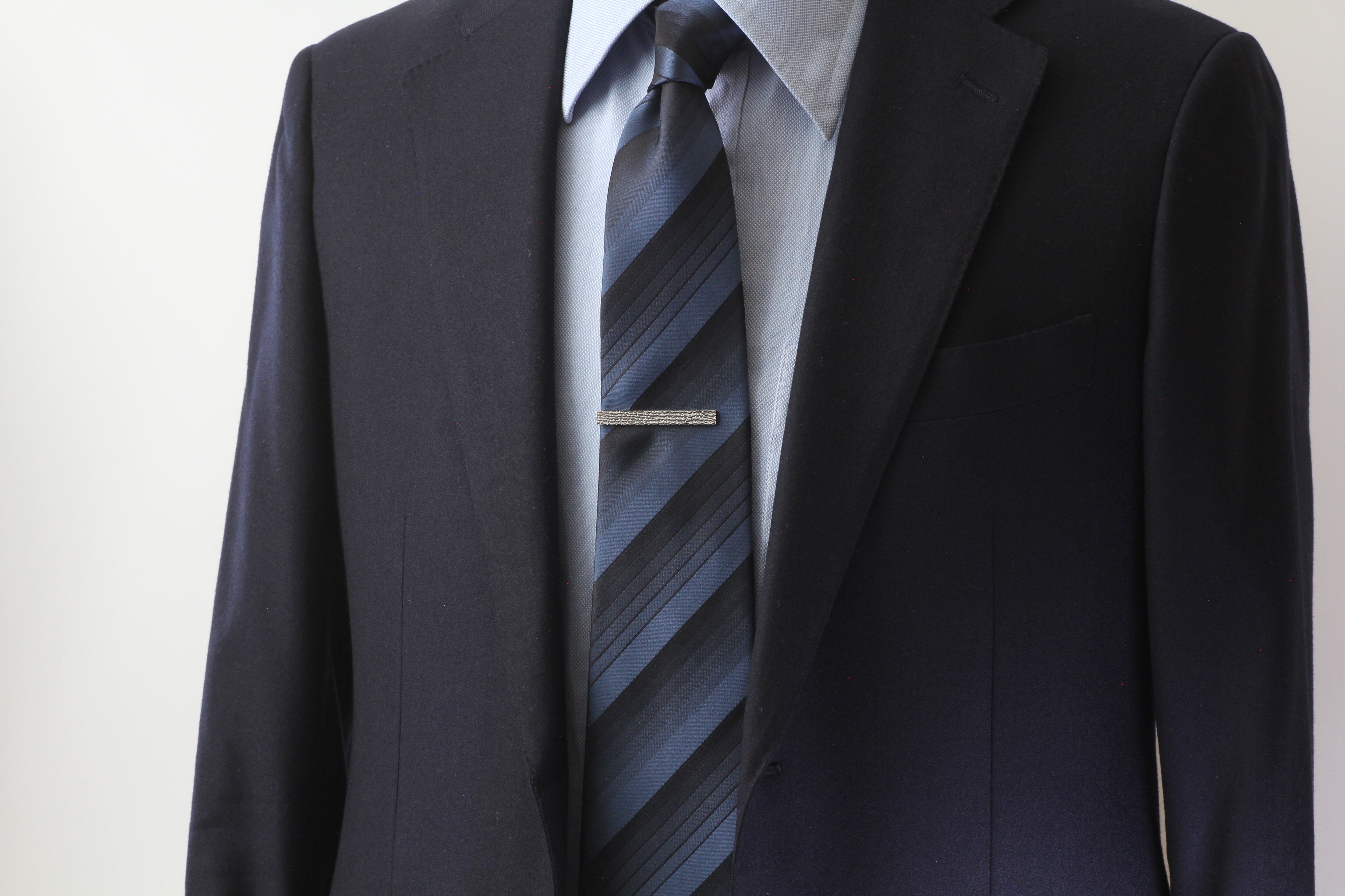 金型にいくつもの柄を彫り込んだタイバーです。定番の形状ながら、よく見ると他との違いがわかる隠れたおしゃれを楽しめるデザインです。